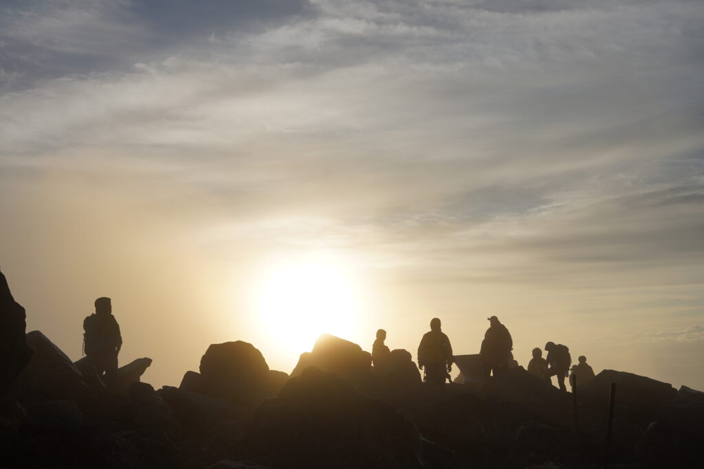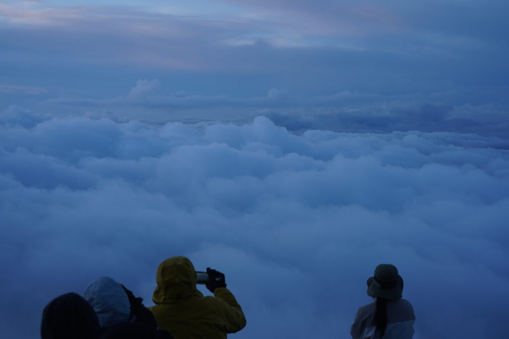 ヘッドライトを付けて山頂へ。昨日にも増してガスが多く、厳しそうだったのですが登る事に意義があります。
